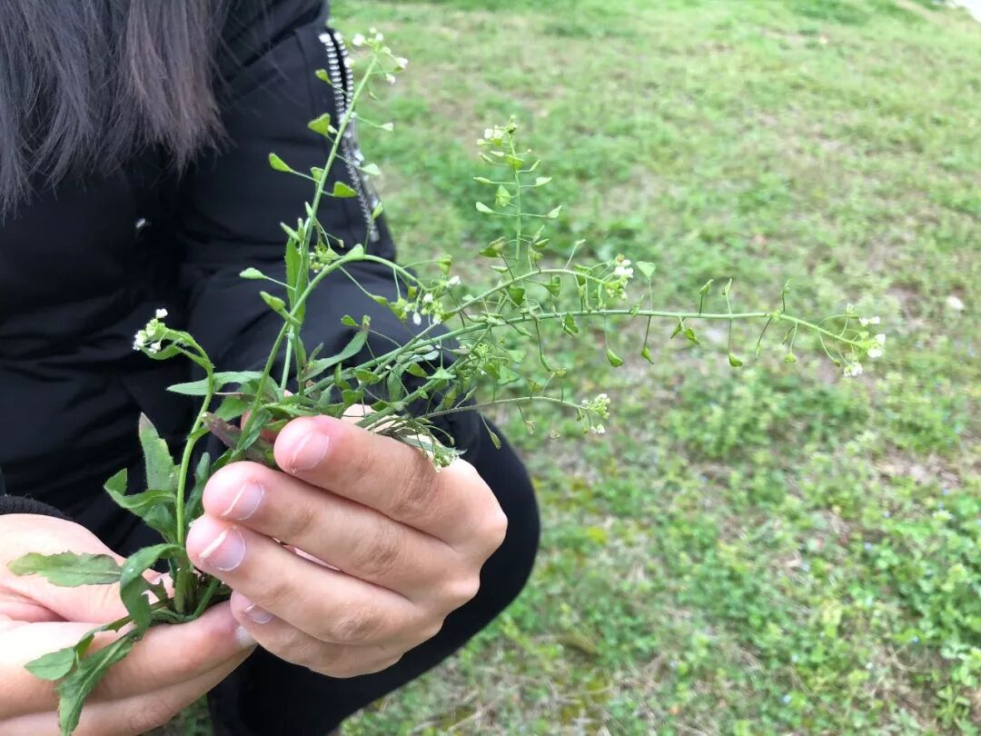 荠菜在耕地边、小河边都很容易找到。辨别荠菜,先看个头,荠菜是挨着地面长的,个头都不大,再看颜色,荠菜的叶子是嫩绿的,颜色很浅,根部是白色的,荠菜叶是羽状分裂的,还有锯齿,摸一摸叶片很薄,可以掰一片叶子看看,如果没有汁液流出来,就八九不离十了。