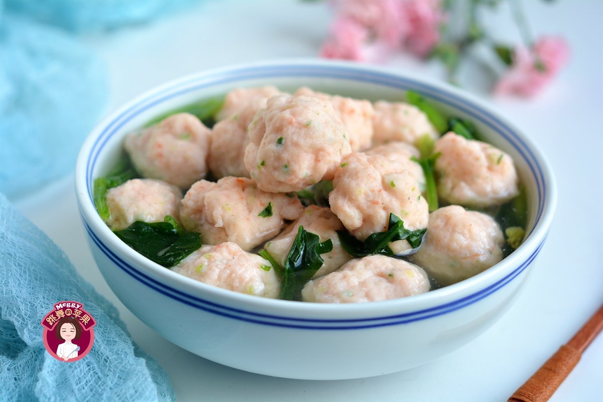 这道汤,营养低脂味鲜美,虾丸搭配菠菜,粉中带绿,看着就清淡可口。250克虾肉、50克肥猪肉、盐、香葱入料理机打成肉糜,水开后,将虾泥挤成丸子入锅中,待丸子全部浮上来,将菠菜 放入水中,撒盐调味。