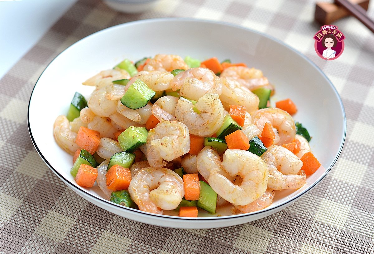 这盘清炒虾仁,5分钟出锅,的家常小菜,颜色衬托得漂亮,口感清脆鲜嫩。胡萝卜、黄瓜切小丁,锅中留底油,将胡萝卜煸炒变色,倒入虾仁,大火翻炒,淋少许料酒,加入黄瓜丁,撒盐调味。